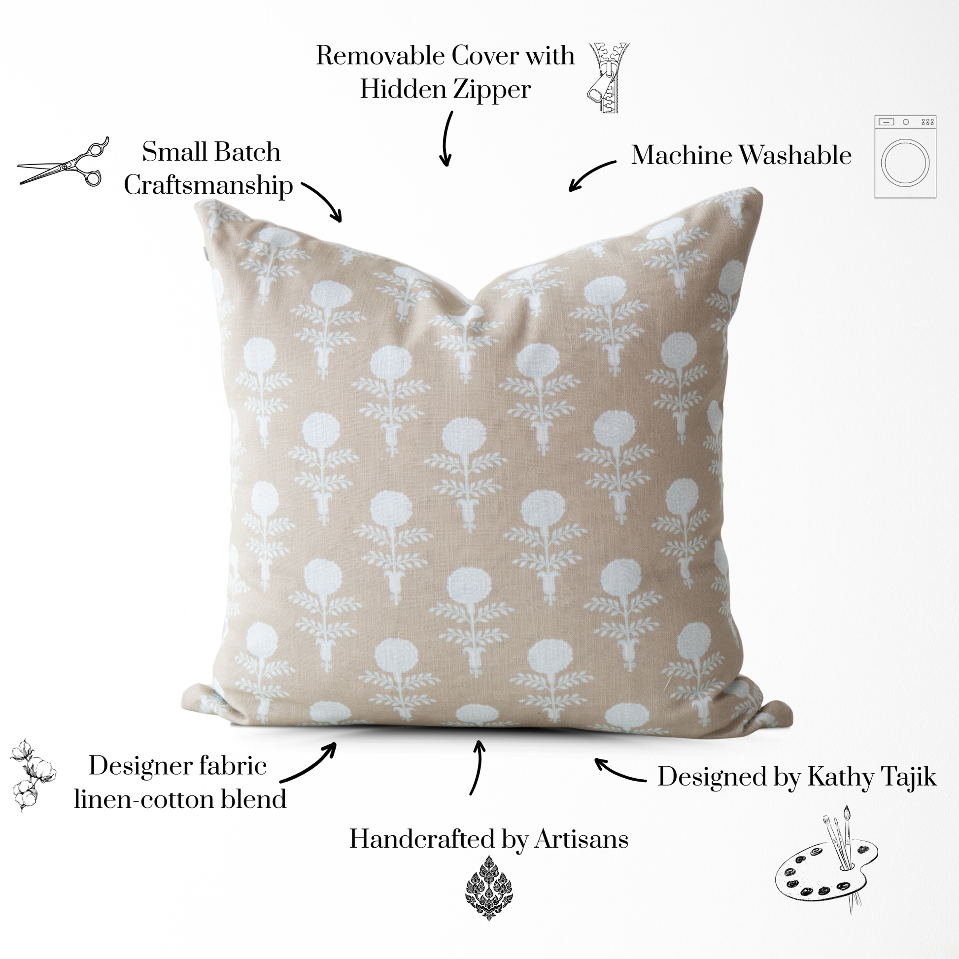 The Elodie Oyster Pillow brings quiet sophistication to any space with its block printed motif, rendered in soft oyst...