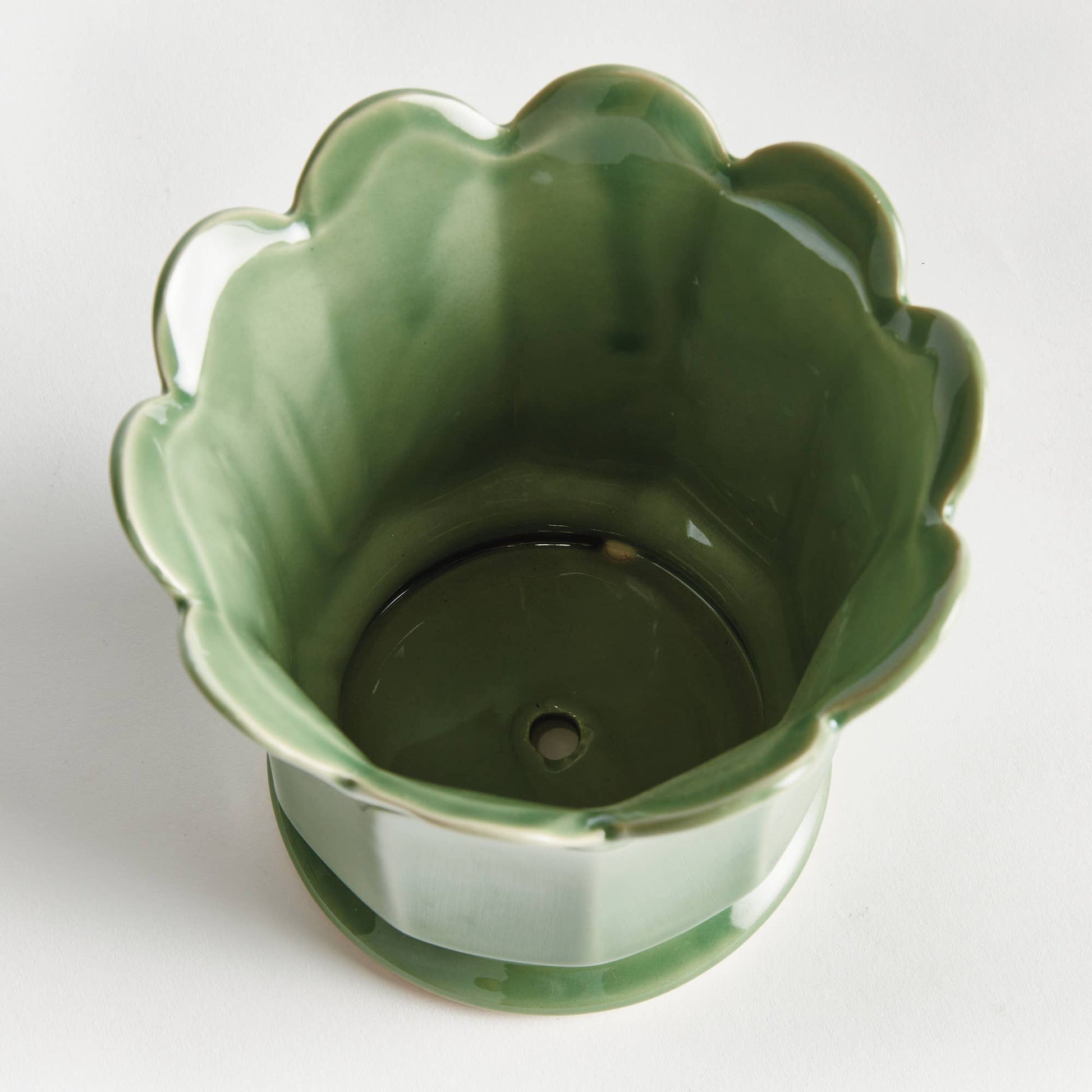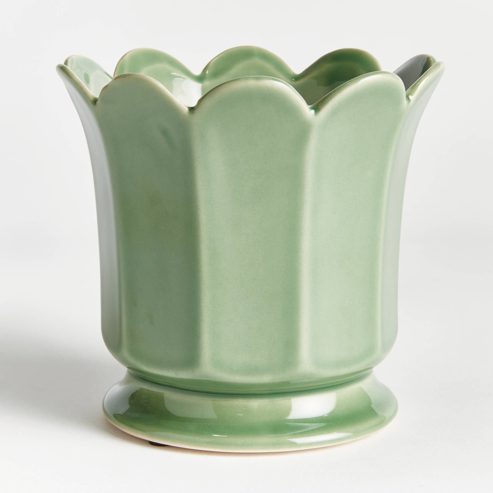 A charming white footed pot with petal edges—perfect for displaying small plants with style and whimsy. Finished in a soft verdant reactive glaze,