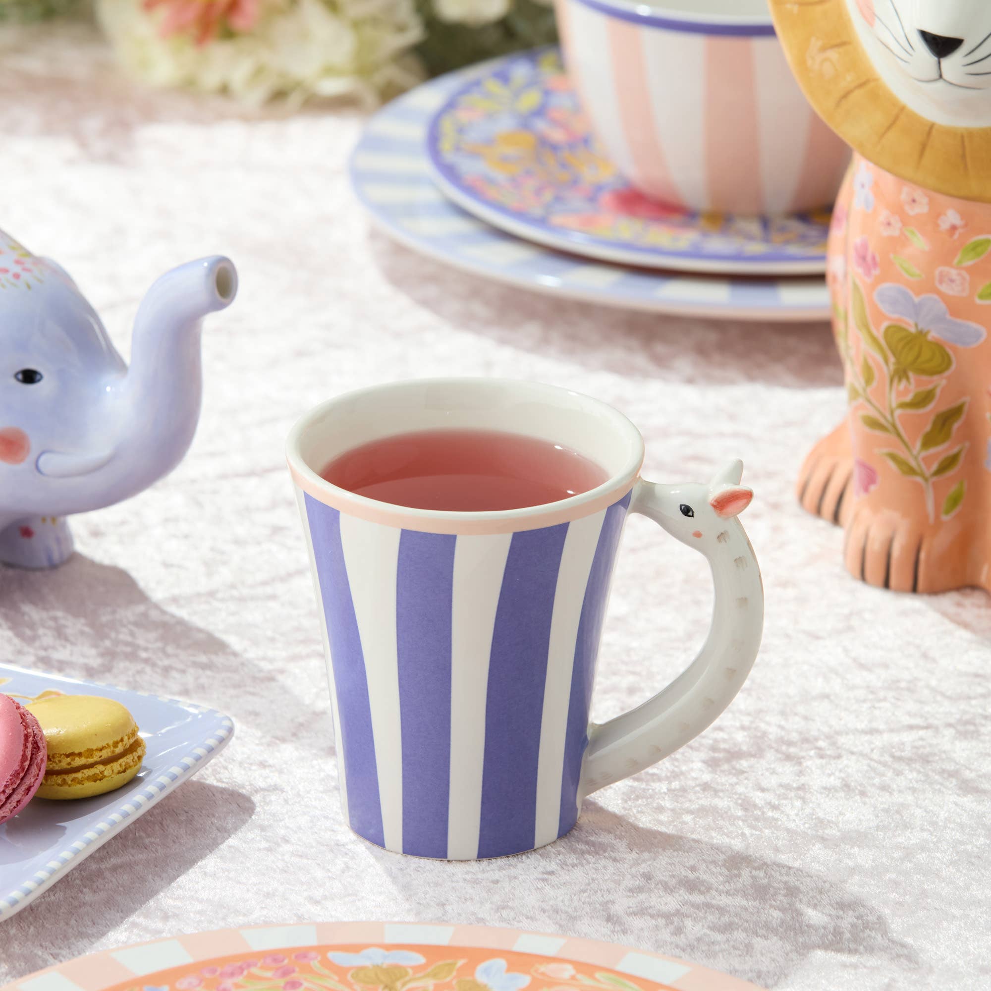 The Menagerie Ceramic Mug transforms daily sipping into a whimsical experience with its sculpted 3‑D animal handles and pastel floral bodies. Each mug showcases a different character—lion, elephant, giraffe or swan—carefully shaped to feel expressive without compromising comfort. Watercolor botanicals wrap softly around the mugs, creating scenes that feel like pages from a storybook brought to life in gentle peach, lavender, coral and sky‑blue hues.