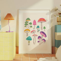 A hand-drawn illustration of colorful mushrooms. Includes collaged details with vintage paper. Printed on enhanced matte paper. Every print option is made to fit a standard frame size, making it simple and easy for you to frame!