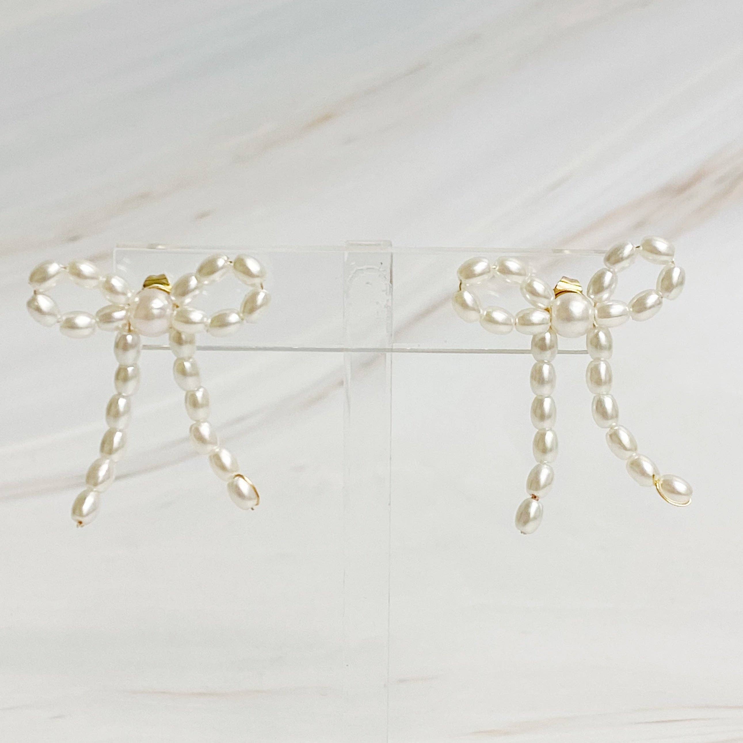 These Pearl Bow Ballerina Earrings strike the perfect balance of boldness and subtlety. With precious pearl beads, they add a touch of elegance to any outfit. Easily dressed up or down for any occasion.