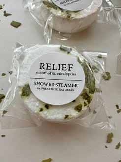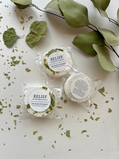 Breathe easy with "Relief" Shower Steamers, expertly crafted to provide soothing sinus relief and refreshing clarity. Infused with menthol crystals, pure eucalyptus essential oil, and fresh dried eucalyptus leaves, this invigorating blend is perfect for easing congestion and revitalizing the senses. When used as directed, each steamer dissolves slowly, lasting at least 20 minutes, providing an invigorating aromatherapy experience. Features - All Natural, Organic Ingredients - Crafted to support clear breathing and sinus relief during showers