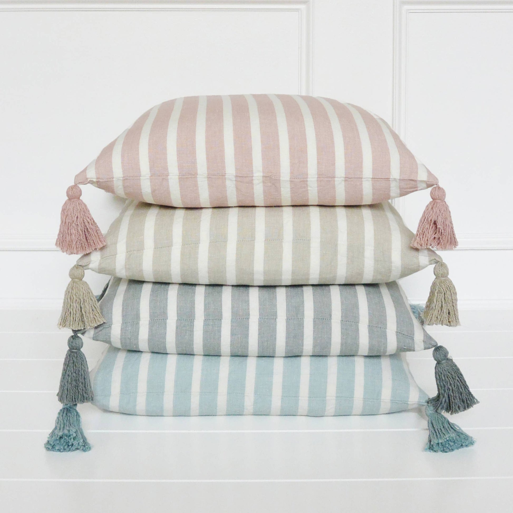 Our stripe tassel collection features a classic spring/summer color palette and a soft stone washed feel. These make perfect layering pillows. The zipper closure makes changing pillow covers simple. These are sure to be the perfect finishing touch to any space.