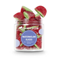 What looks like a watermelon and tastes like a watermelon but isn't a watermelon. It's our watermelon slices candy — tender, tangy pink candies that make any season feel like summer. These candies even have a green colored "rind" that is tasty sweet too!. Best yet, with no seed in sight, these gummy slices delights make better watermelons than watermelons.