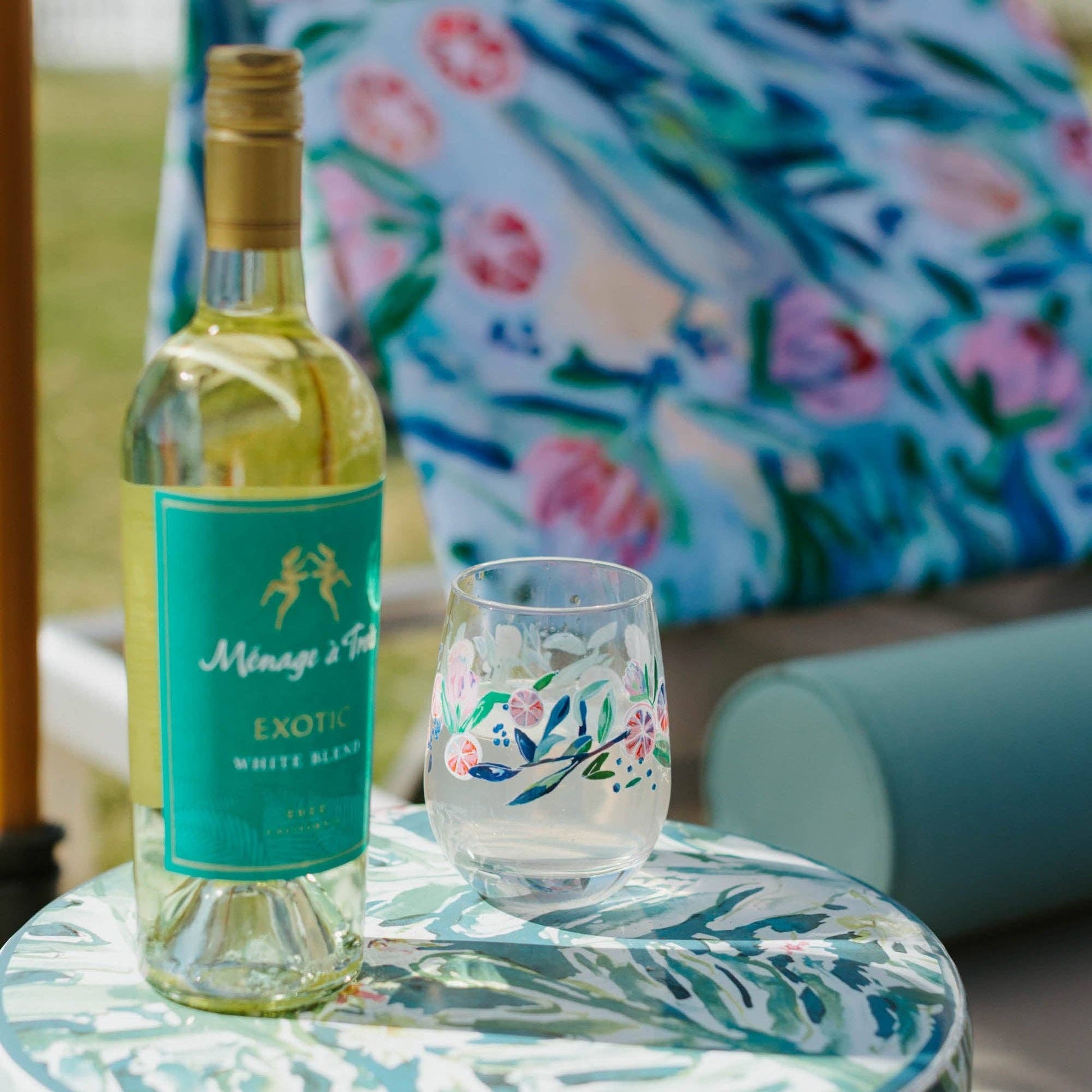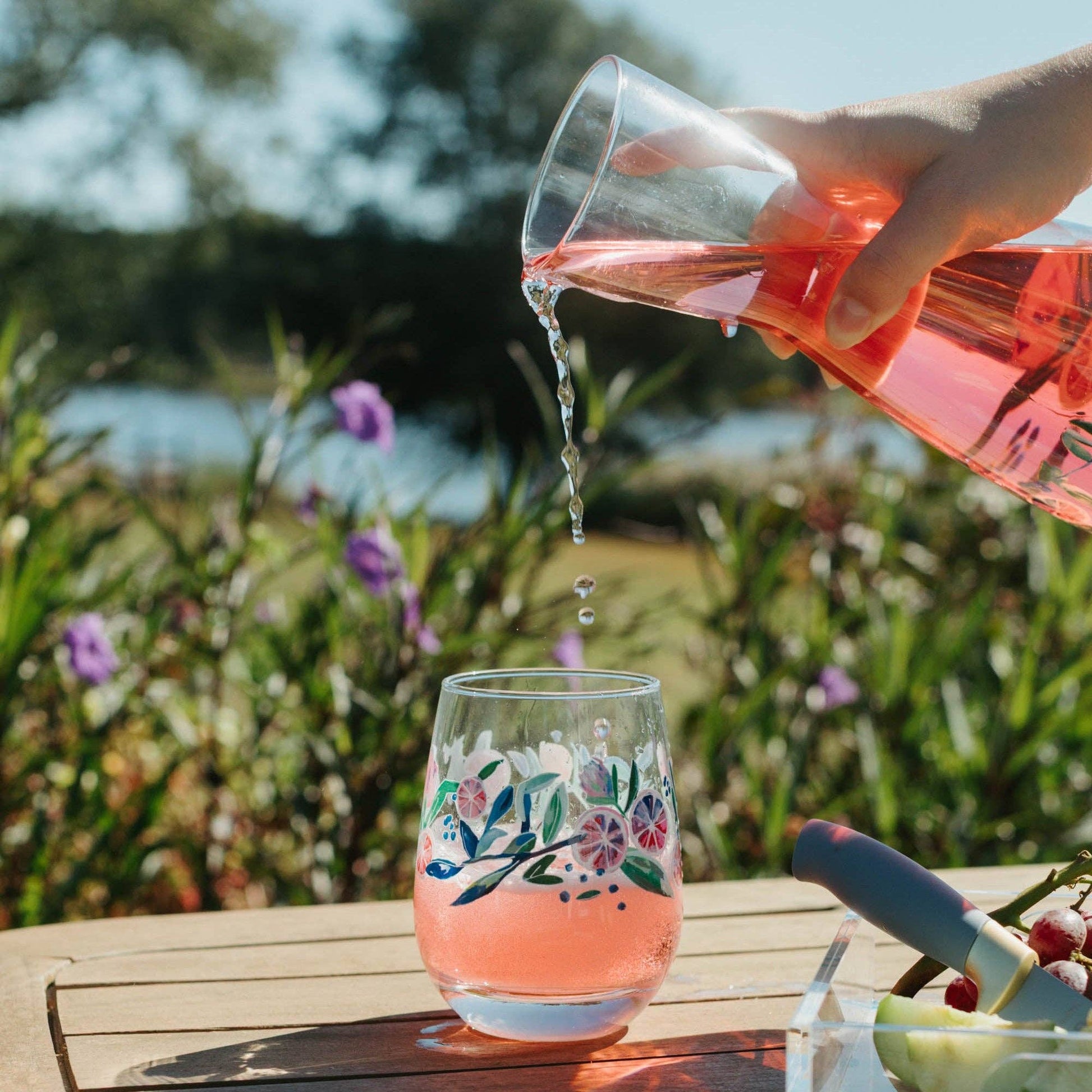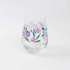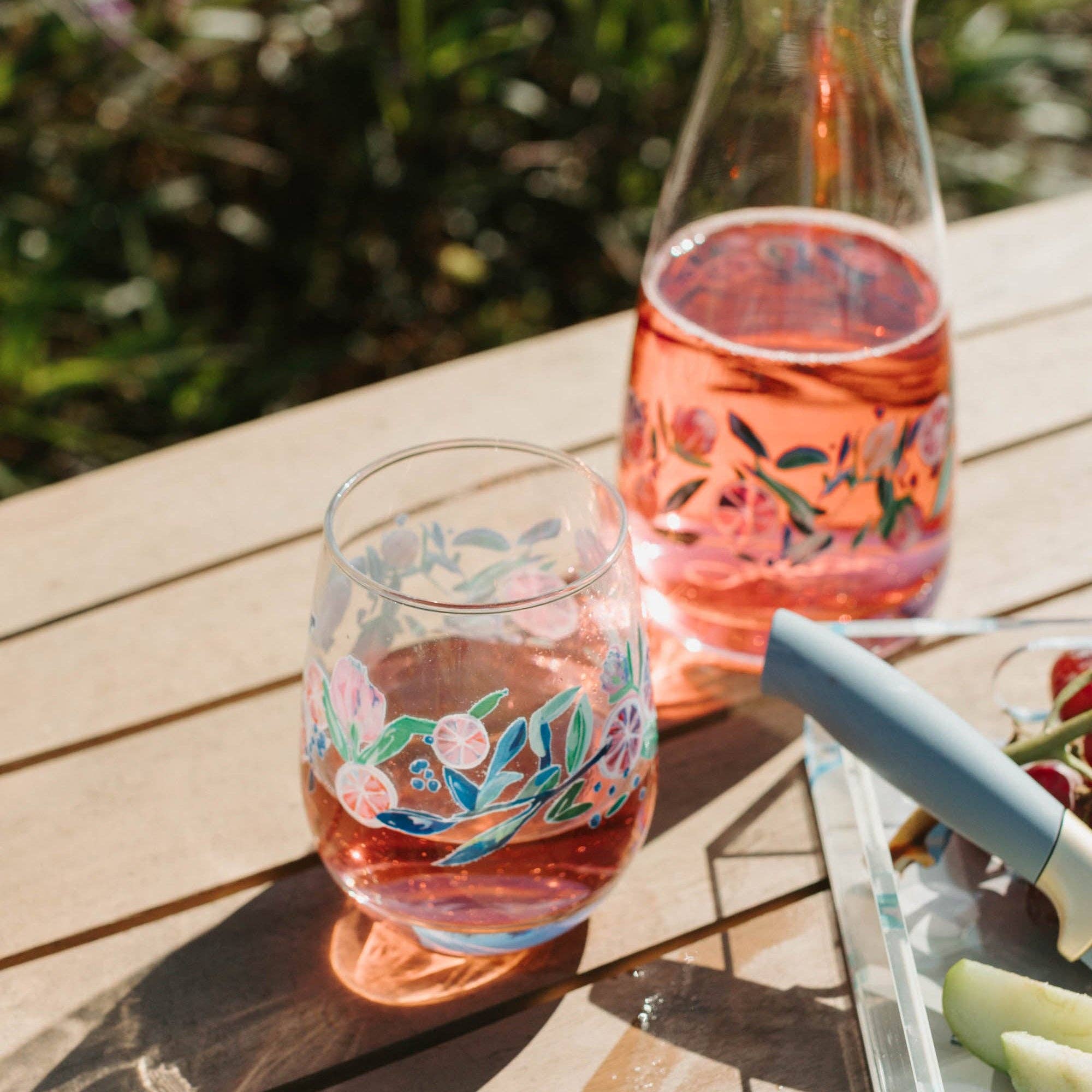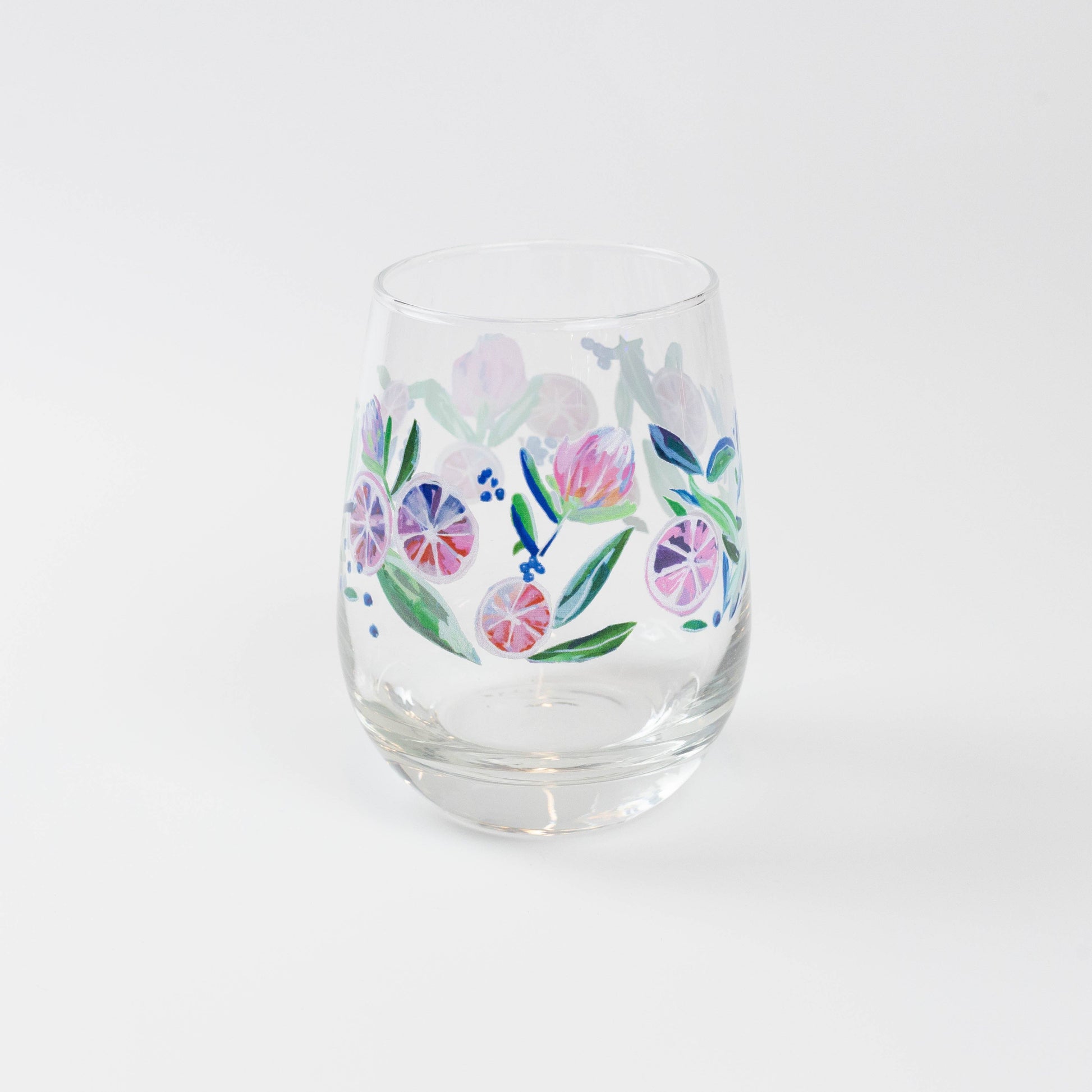15.25oz stemless wine glass featuring original artwork by Kim Hovell - Citrus Crush. Printed on high-quality 15.25oz Libbey glassware, Kim Hovell's artwork pops through the glass, whether you're drinking wine, juice, or water.